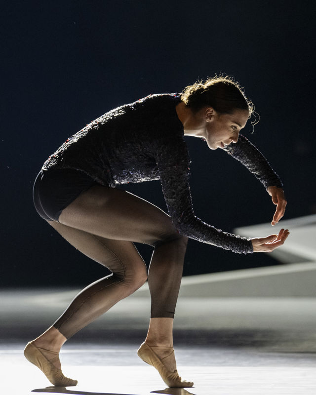 From the moment she emerges from the auditorium and balances onto the stage floor, she remains on stage until the very end of the performance – treating us to Kylián’s moving solos and duets together with the other dancers.