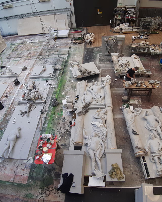 – Metoden med pappmasjé er for øvrig ikke ukjent fra da palassene skulle ha ornamentert stukkatur i alle rom, forteller de. – På Drottningholm, det kongelige slottet og teatret utenfor Stockholm, og på Rød herregård i Halden benyttet man denne teknikken. Og i Italia har de hatt tradisjoner for dette i flere hundre år, når store saler og tak skulle utsmykkes. Ornamentene ble enklere å montere, de risikerte ikke å sprekke opp, og det var billig. Så dekket de dem til slutt med et tynt lag av gips som de malte eller forgylte.
