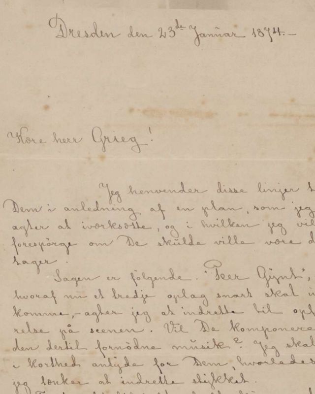 I neste brev et par uker senere var Ibsen svært tilfreds med at Grieg var med, og skrev: «Hvor meget musik, og til hvilke scener De vil komponere, overlades naturligvis ganske til Dem selv; en komponist må jo heri have fulkommen frie hænder.»