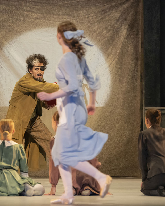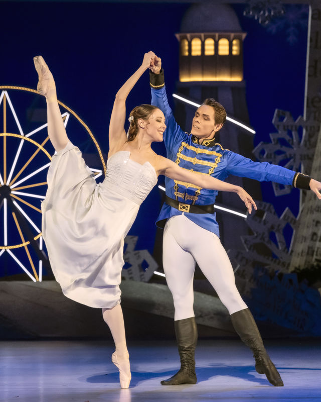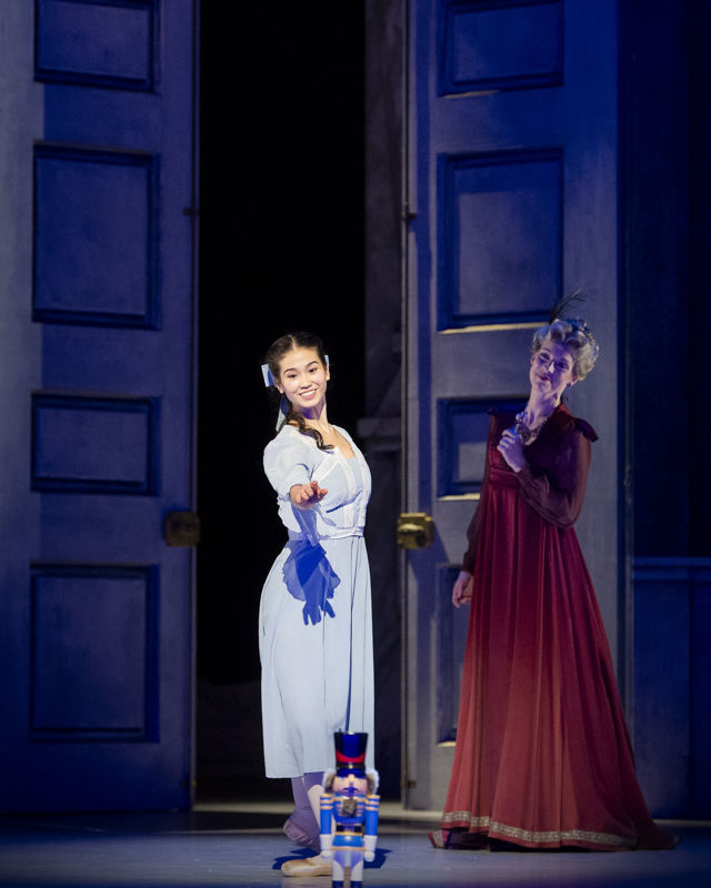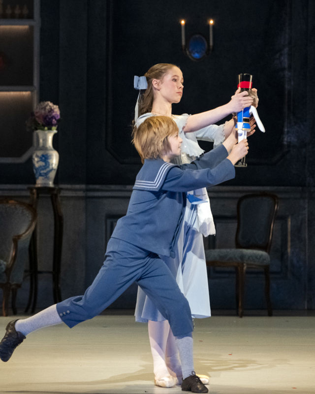 Nasjonalballettens dansere deler scene med elever fra Ballettskolen, som alle tolker et mylder av roller – fra prinsen, Lille og Store Clara og rotter til vafler med rømme.