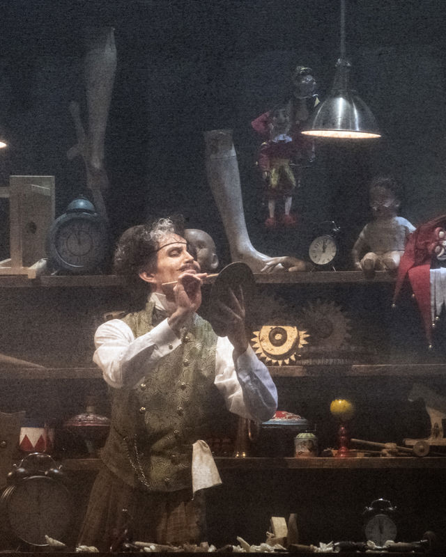 Plutselig står Drosselmeyer der. Nå er han liksom forandret, og beveger seg sånn som trekk-opp-dukkene han lager. Deretter dukker det opp stirrende øyne i mørket, og Clara våkner …