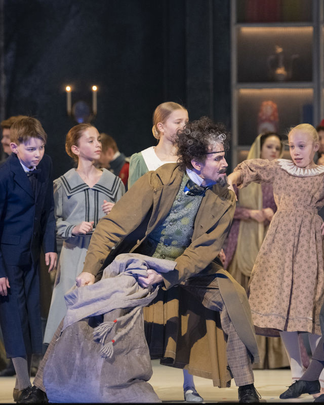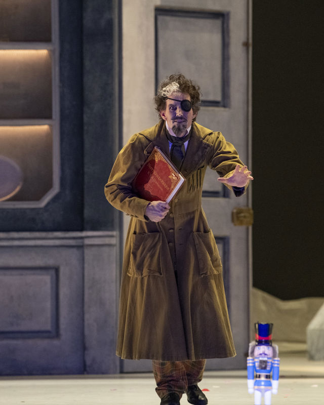 Den siste som kommer til festen, er Drosselmeyer. Han har overraskelser til alle: Først deler han ut julegaver til barna. Deretter begynner han å lese fra en stor bok, mens et skyggeteater blir vist bak ham. De får se en prinsesse og en prins, og prinsessen holder en stor, gyllen nøtt. Plutselig ser de en skummel rottekonge som forsøker å spise både nøtta og prinsessen. Her slutter Drosselmeyer å lese, og i stedet viser han fram tre store trekk-opp-dukker: De ser ut som prinsessen, prinsen og Rottekongen, og Drosselmeyer får dukkene til å danse.